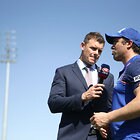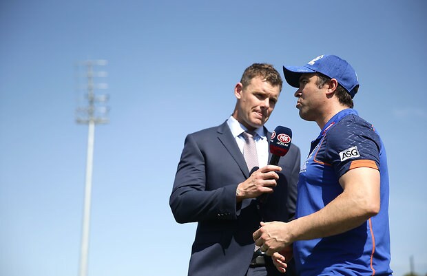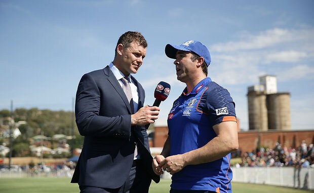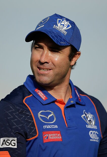 WAGGA WAGGA, AUSTRALIA - MARCH 05: Cameron Mooney interviews Kangaroos head coach Brad Scott before the 2016 AFL NAB Challenge match between the North Melbourne Kangaroos and the Collingwood Magpies at Robertson Oval on March 5, 2016 in Wagga Wagga, Australia. (Photo by Mark Metcalfe/Getty Images/AFL Media)