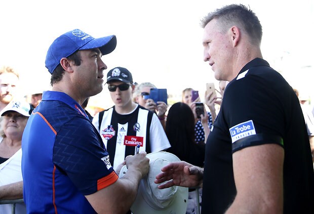 WAGGA WAGGA, AUSTRALIA - MARCH 05: Magpies head coach Nathan Buckley signs autographs before the 2016 AFL NAB Challenge match between the North Melbourne Kangaroos and the Collingwood Magpies at Robertson Oval on March 5, 2016 in Wagga Wagga, Australia. (Photo by Mark Metcalfe/Getty Images/AFL Media)