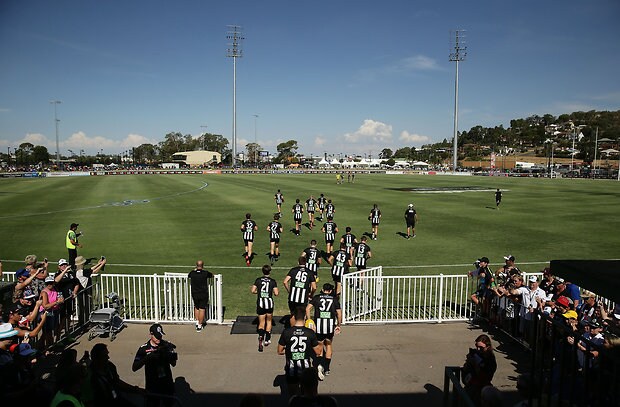WAGGA WAGGA, AUSTRALIA - MARCH 05: Magpies players run onto the field to warm up before the 2016 AFL NAB Challenge match between the North Melbourne Kangaroos and the Collingwood Magpies at Robertson Oval on March 5, 2016 in Wagga Wagga, Australia. (Photo by Mark Metcalfe/Getty Images/AFL Media)