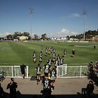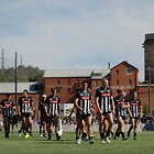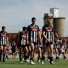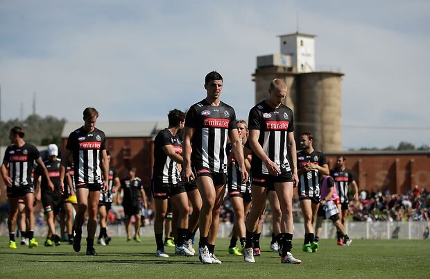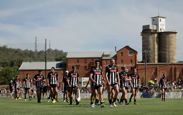WAGGA WAGGA, AUSTRALIA - MARCH 05: Magpies players walk from the field after warm up before the 2016 AFL NAB Challenge match between the North Melbourne Kangaroos and the Collingwood Magpies at Robertson Oval on March 5, 2016 in Wagga Wagga, Australia. (Photo by Mark Metcalf/Getty Images/AFL Media)