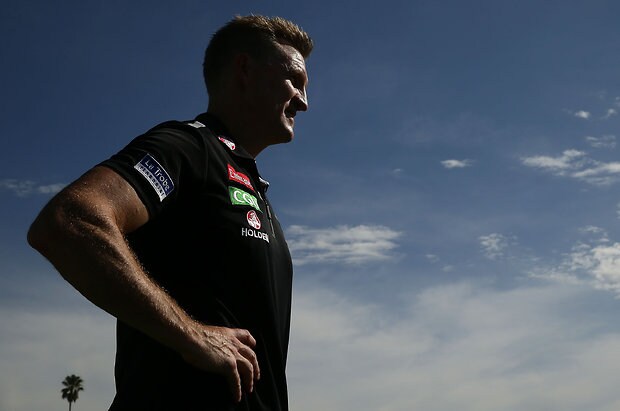 WAGGA WAGGA, AUSTRALIA - MARCH 05: Magpies head coach Nathan Buckley looks on before the 2016 AFL NAB Challenge match between the North Melbourne Kangaroos and the Collingwood Magpies at Robertson Oval on March 5, 2016 in Wagga Wagga, Australia. (Photo by Mark Metcalf/Getty Images/AFL Media)