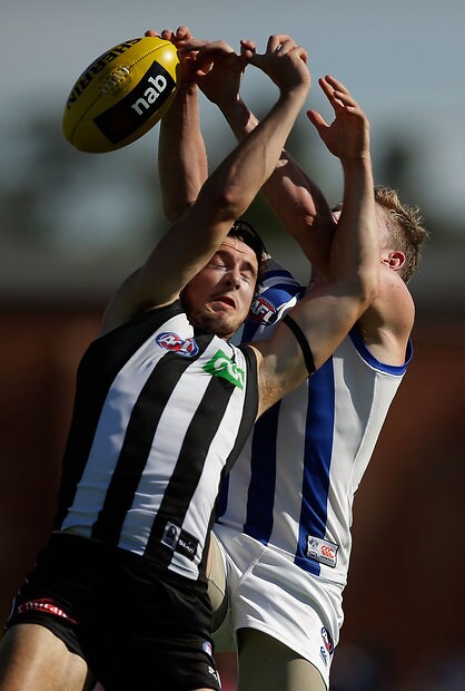 WAGGA WAGGA, AUSTRALIA - MARCH 05: Jack Frost of the Magpies and Lachlan Hansen of the Kangaroos compete for the ball during the 2016 AFL NAB Challenge match between the North Melbourne Kangaroos and the Collingwood Magpies at Robertson Oval on March 5, 2016 in Wagga Wagga, Australia. (Photo by Mark Metcalf/Getty Images/AFL Media)
