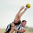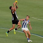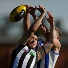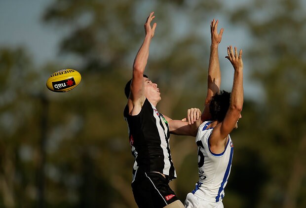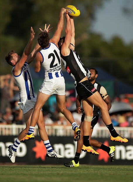 WAGGA WAGGA, AUSTRALIA - MARCH 05: Tom Phillips of the Magpies and Jack Ziebell of the Kangaroos compete for a mark during the 2016 AFL NAB Challenge match between the North Melbourne Kangaroos and the Collingwood Magpies at Robertson Oval on March 5, 2016 in Wagga Wagga, Australia. (Photo by Mark Metcalf/Getty Images/AFL Media)