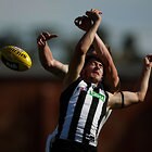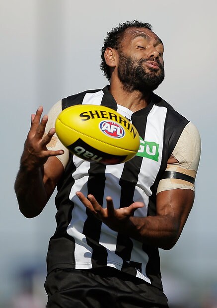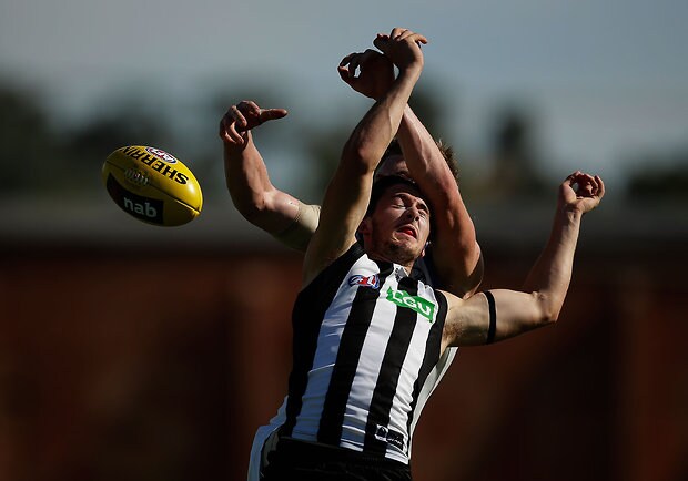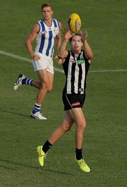 WAGGA WAGGA, AUSTRALIA - MARCH 05: Travis Varcoe of the Magpies marks the ball during the 2016 AFL NAB Challenge match between the North Melbourne Kangaroos and the Collingwood Magpies at Robertson Oval on March 5, 2016 in Wagga Wagga, Australia. (Photo by Mark Metcalf/Getty Images/AFL Media)