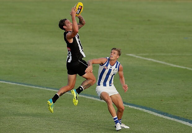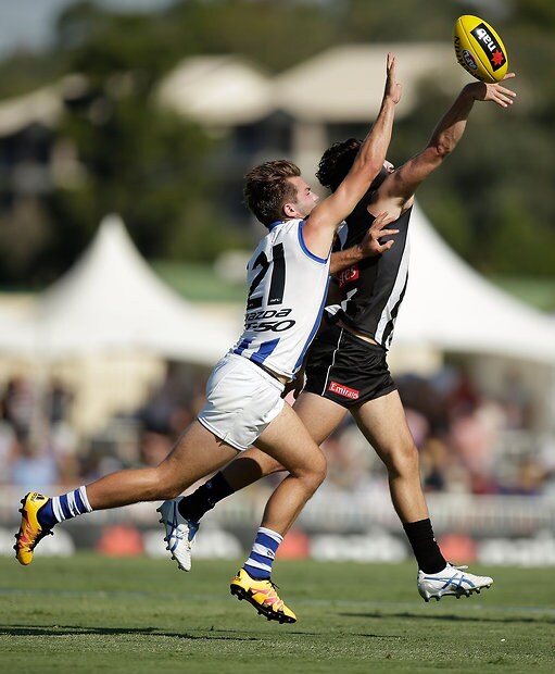 WAGGA WAGGA, AUSTRALIA - MARCH 05: Darcy Moore of the Magpies and Luke McDonald of the Kangaroos compte for a mark during the 2016 AFL NAB Challenge match between the North Melbourne Kangaroos and the Collingwood Magpies at Robertson Oval on March 5, 2016 in Wagga Wagga, Australia. (Photo by Mark Metcalf/Getty Images/AFL Media) *** Local Caption *** Darcy Moore; Luke McDonald