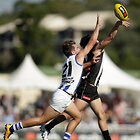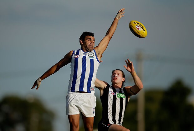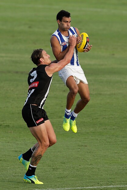 WAGGA WAGGA, AUSTRALIA - MARCH 05: Lindsay Thomas of the Kangaroos marks the ball ahead of Jesse White of the Magpies during the 2016 AFL NAB Challenge match between the North Melbourne Kangaroos and the Collingwood Magpies at Robertson Oval on March 5, 2016 in Wagga Wagga, Australia. (Photo by Mark Metcalf/Getty Images/AFL Media)
