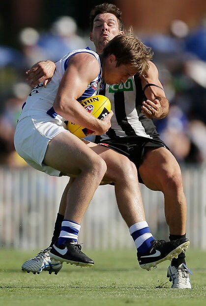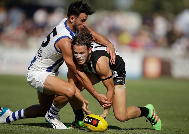 WAGGA WAGGA, AUSTRALIA - MARCH 05: Jack Ziebell of the Kangaroos is tackled by Jarryd Blair of the Magpies during the 2016 AFL NAB Challenge match between the North Melbourne Kangaroos and the Collingwood Magpies at Robertson Oval on March 5, 2016 in Wagga Wagga, Australia. (Photo by Mark Metcalf/Getty Images/AFL Media)