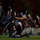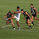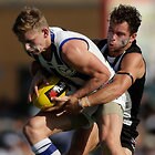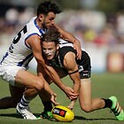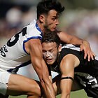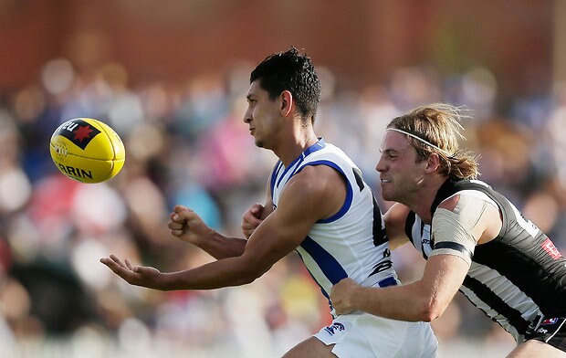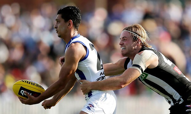 WAGGA WAGGA, AUSTRALIA - MARCH 05: Robin Nahas of the Kangaroos is tackled by Ben Sinclair of the Magpies during the 2016 AFL NAB Challenge match between the North Melbourne Kangaroos and the Collingwood Magpies at Robertson Oval on March 5, 2016 in Wagga Wagga, Australia. (Photo by Mark Metcalf/Getty Images/AFL Media)