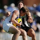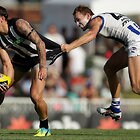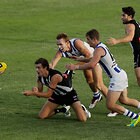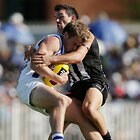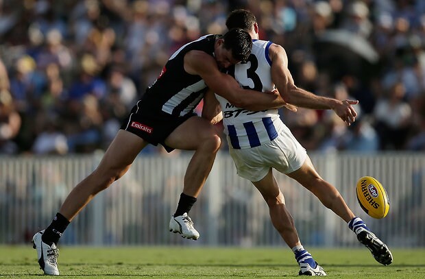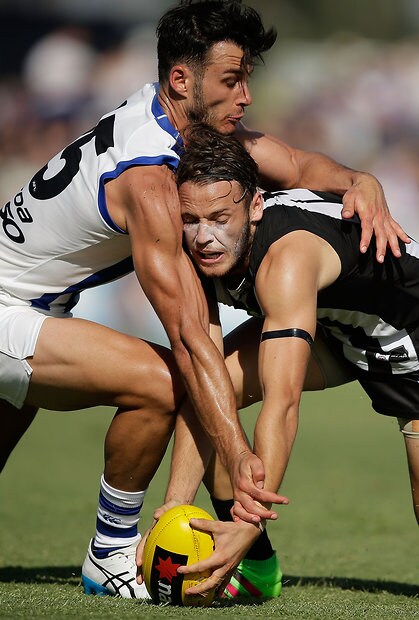 WAGGA WAGGA, AUSTRALIA - MARCH 05: Scott Pendlebury of the Magpies tackles Sam Gibson of the Kangaroos during the 2016 AFL NAB Challenge match between the North Melbourne Kangaroos and the Collingwood Magpies at Robertson Oval on March 5, 2016 in Wagga Wagga, Australia. (Photo by Mark Metcalf/Getty Images/AFL Media)