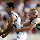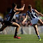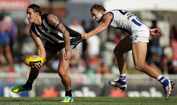 WAGGA WAGGA, AUSTRALIA - MARCH 05: Lindsay Thomas of the Kangaroos and Ben Sinclair of the Magpies during the 2016 AFL NAB Challenge match between the North Melbourne Kangaroos and the Collingwood Magpies at Robertson Oval on March 5, 2016 in Wagga Wagga, Australia. (Photo by Mark Metcalf/Getty Images/AFL Media)