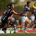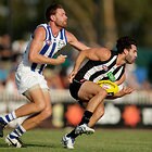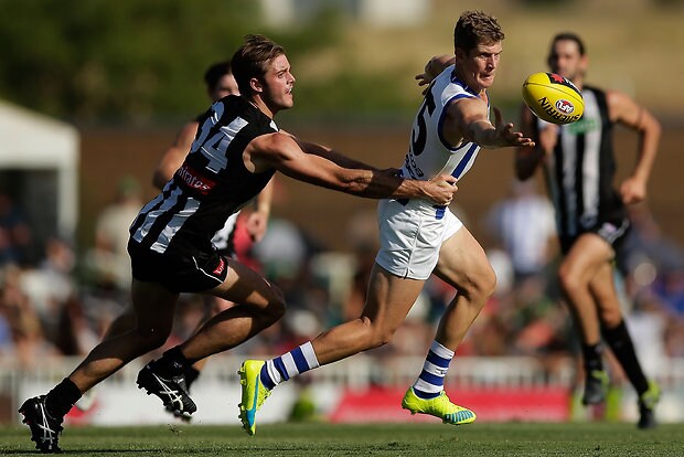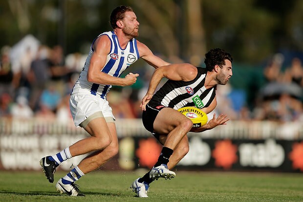 WAGGA WAGGA, AUSTRALIA - MARCH 05: Nick Dal Santo of the Kangaroos is challenged by Alan Toovey of the Magpies during the 2016 AFL NAB Challenge match between the North Melbourne Kangaroos and the Collingwood Magpies at Robertson Oval on March 5, 2016 in Wagga Wagga, Australia. (Photo by Mark Metcalf/Getty Images/AFL Media)