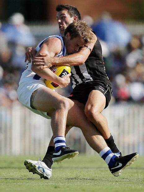 WAGGA WAGGA, AUSTRALIA - MARCH 05: Jesse White of the Magpies is tackled by Drew Petrie of the Kangaroos during the 2016 AFL NAB Challenge match between the North Melbourne Kangaroos and the Collingwood Magpies at Robertson Oval on March 5, 2016 in Wagga Wagga, Australia. (Photo by Mark Metcalf/Getty Images/AFL Media)