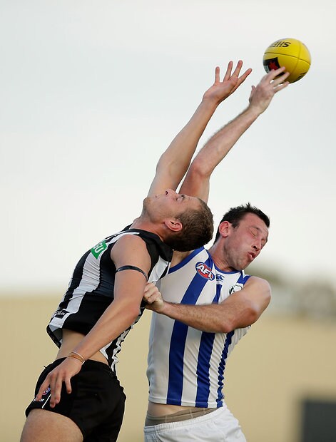WAGGA WAGGA, AUSTRALIA - MARCH 05: James Aish of the Magpies and Robbie Tarrant of the Kangaroos compete for the ball during the 2016 AFL NAB Challenge match between the North Melbourne Kangaroos and the Collingwood Magpies at Robertson Oval on March 5, 2016 in Wagga Wagga, Australia. (Photo by Mark Metcalf/Getty Images/AFL Media)