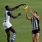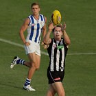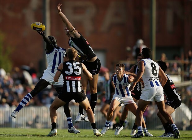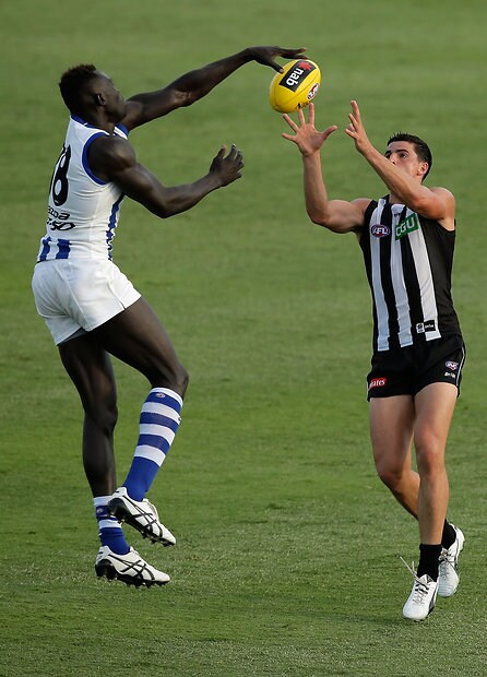 WAGGA WAGGA, AUSTRALIA - MARCH 05: Majak Daw of the Kangaroos and Scott Pendlebury of the Magpies compete for the ball during the 2016 AFL NAB Challenge match between the North Melbourne Kangaroos and the Collingwood Magpies at Robertson Oval on March 5, 2016 in Wagga Wagga, Australia. (Photo by Mark Metcalf/Getty Images/AFL Media)