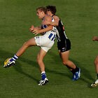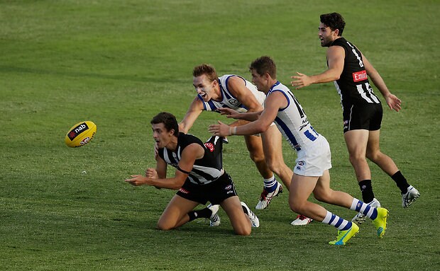 WAGGA WAGGA, AUSTRALIA - MARCH 05: Trent Dumont of the Kangaroos is tackled by Jarryd Blair of the Magpies during the 2016 AFL NAB Challenge match between the North Melbourne Kangaroos and the Collingwood Magpies at Robertson Oval on March 5, 2016 in Wagga Wagga, Australia. (Photo by Mark Metcalf/Getty Images/AFL Media)