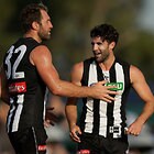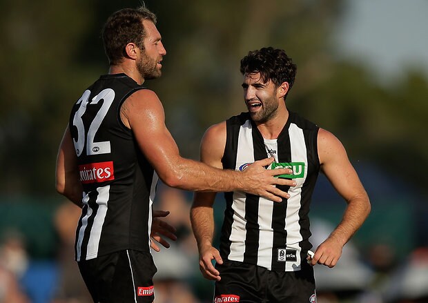 WAGGA WAGGA, AUSTRALIA - MARCH 05: Alex Fasolo of the Magpies celebrates after kicking a goal with Travis Cloke of the Magpies during the 2016 AFL NAB Challenge match between the North Melbourne Kangaroos and the Collingwood Magpies at Robertson Oval on March 5, 2016 in Wagga Wagga, Australia. (Photo by Mark Metcalf/Getty Images/AFL Media)