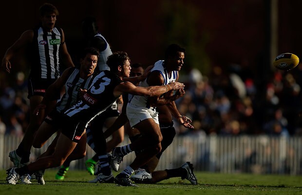 WAGGA WAGGA, AUSTRALIA - MARCH 05: Adam Oxley of the Magpies handpasses the ball during the 2016 AFL NAB Challenge match between the North Melbourne Kangaroos and the Collingwood Magpies at Robertson Oval on March 5, 2016 in Wagga Wagga, Australia. (Photo by Mark Metcalf/Getty Images/AFL Media)