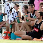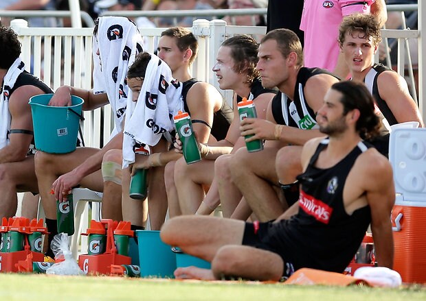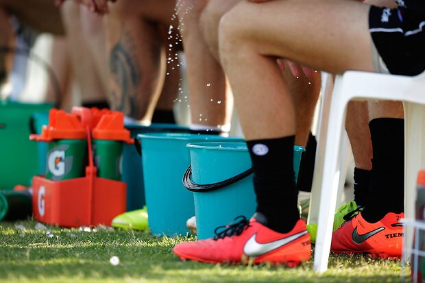 WAGGA WAGGA, AUSTRALIA - MARCH 05: Magpies players use buckets and towels to keep cool during the 2016 AFL NAB Challenge match between the North Melbourne Kangaroos and the Collingwood Magpies at Robertson Oval on March 5, 2016 in Wagga Wagga, Australia. (Photo by Mark Metcalf/Getty Images/AFL Media)