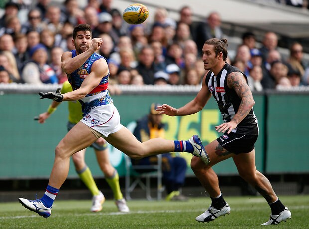 MELBOURNE, AUSTRALIA - MAY 29: Marcus Adams of the Bulldogs in action ahead of Darcy Moore of the Magpies during the 2016 AFL Round 10 match between the Collingwood Magpies and the Western Bulldogs at the Melbourne Cricket Ground on May 29, 2016 in Melbourne, Australia. (Photo by Adam Trafford/AFL Media)