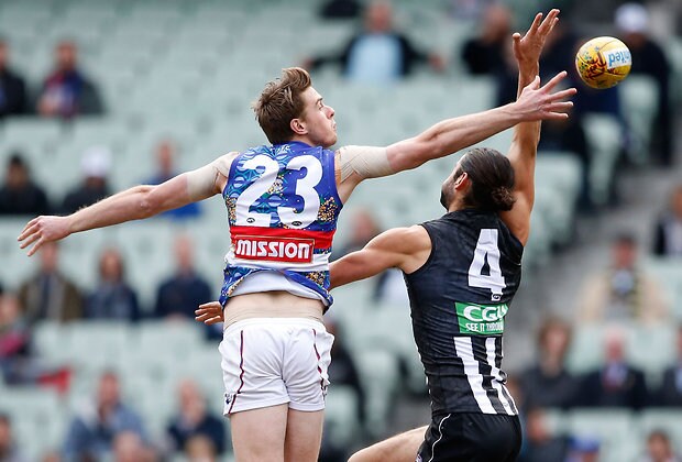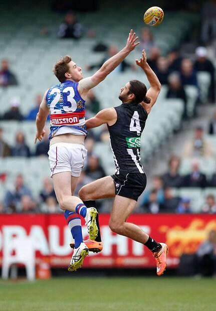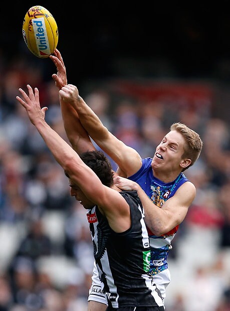 MELBOURNE, AUSTRALIA - MAY 29: Mason Cox of the Magpies and Tom Campbell of the Bulldogs compete in a ruck contest during the 2016 AFL Round 10 match between the Collingwood Magpies and the Western Bulldogs at the Melbourne Cricket Ground on May 29, 2016 in Melbourne, Australia. (Photo by Adam Trafford/AFL Media)