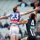 MELBOURNE, AUSTRALIA - MAY 29: Travis Varcoe of the Magpies marks the ball ahead of Jordan Roughead of the Bulldogs during the 2016 AFL Round 10 match between the Collingwood Magpies and the Western Bulldogs at the Melbourne Cricket Ground on May 29, 2016 in Melbourne, Australia. (Photo by Adam Trafford/AFL Media)