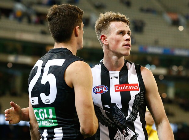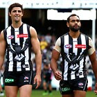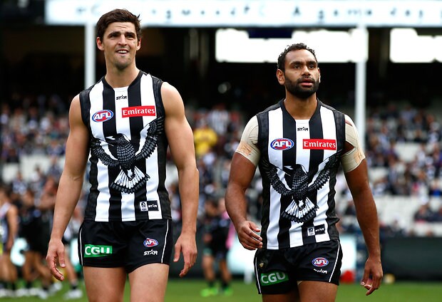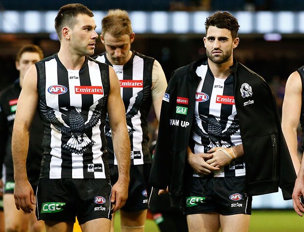 MELBOURNE, AUSTRALIA - MAY 29: Ben Crocker (right) and Jack Crisp of the Magpies look dejected after a loss during the 2016 AFL Round 10 match between the Collingwood Magpies and the Western Bulldogs at the Melbourne Cricket Ground on May 29, 2016 in Melbourne, Australia. (Photo by Adam Trafford/AFL Media)