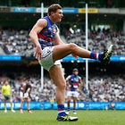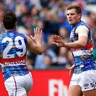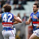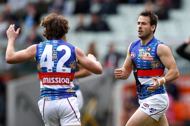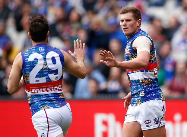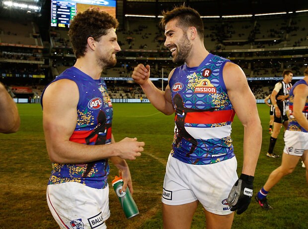 MELBOURNE, AUSTRALIA - MAY 29: Jordan Roughead of the Bulldogs celebrates with Matthew Boyd of the Bulldogs during the 2016 AFL Round 10 match between the Collingwood Magpies and the Western Bulldogs at the Melbourne Cricket Ground on May 29, 2016 in Melbourne, Australia. (Photo by Adam Trafford/AFL Media)