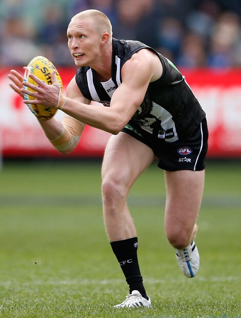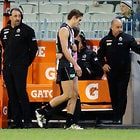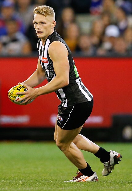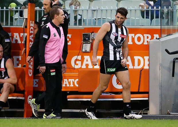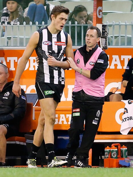 MELBOURNE, AUSTRALIA - MAY 29: Darcy Moore of the Magpies comes off the ground injured during the 2016 AFL Round 10 match between the Collingwood Magpies and the Western Bulldogs at the Melbourne Cricket Ground on May 29, 2016 in Melbourne, Australia. (Photo by Adam Trafford/AFL Media)