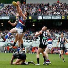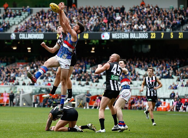 MELBOURNE, AUSTRALIA - MAY 29: Jake Stringer of the Bulldogs and Jack Frost of the Magpies compete for the ball during the 2016 AFL Round 10 match between the Collingwood Magpies and the Western Bulldogs at the Melbourne Cricket Ground on May 29, 2016 in Melbourne, Australia. (Photo by Adam Trafford/AFL Media)