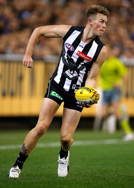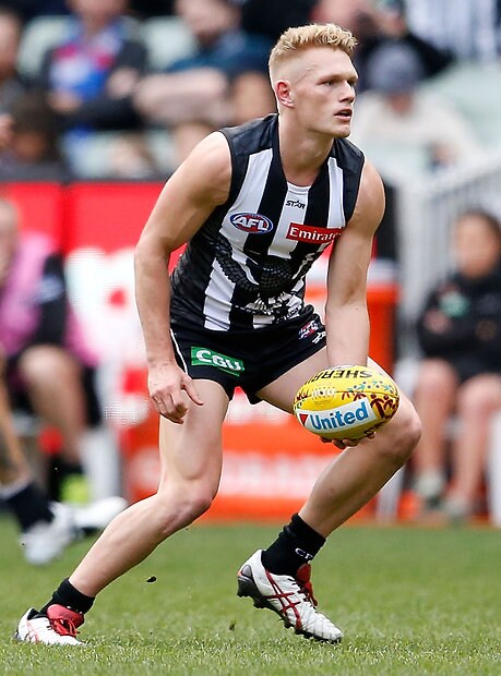 MELBOURNE, AUSTRALIA - MAY 29: Taylor Adams of the Magpies kicks the ball during the 2016 AFL Round 10 match between the Collingwood Magpies and the Western Bulldogs at the Melbourne Cricket Ground on May 29, 2016 in Melbourne, Australia. (Photo by Adam Trafford/AFL Media)