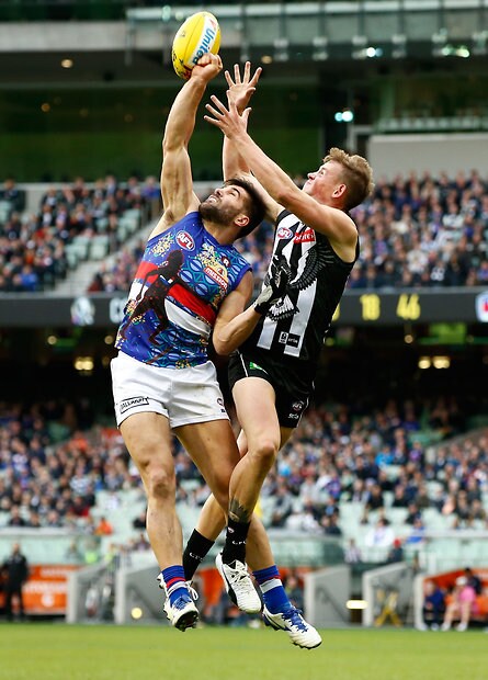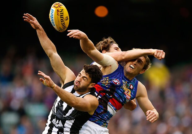 MELBOURNE, AUSTRALIA - MAY 29: Brodie Grundy of the Magpies and Jordan Roughead of the Bulldogs compete in a ruck contest during the 2016 AFL Round 10 match between the Collingwood Magpies and the Western Bulldogs at the Melbourne Cricket Ground on May 29, 2016 in Melbourne, Australia. (Photo by Adam Trafford/AFL Media)