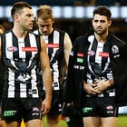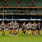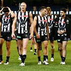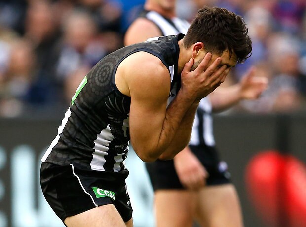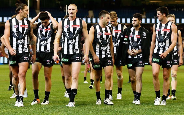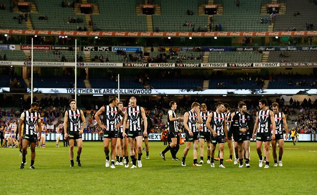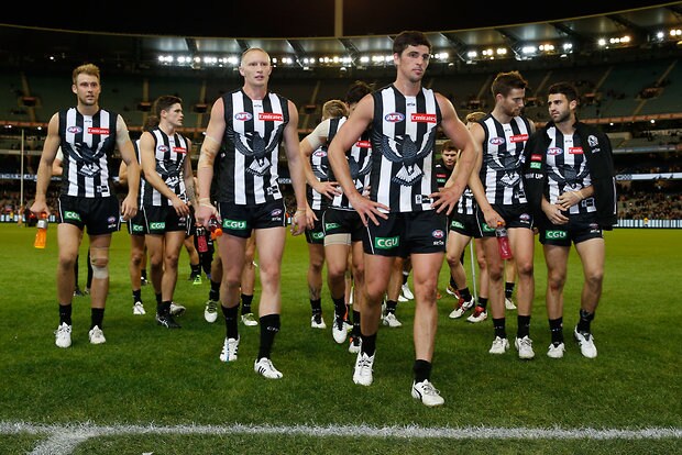 MELBOURNE, AUSTRALIA - MAY 29: Magpies players look dejected after a loss during the 2016 AFL Round 10 match between the Collingwood Magpies and the Western Bulldogs at the Melbourne Cricket Ground on May 29, 2016 in Melbourne, Australia. (Photo by Adam Trafford/AFL Media)