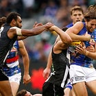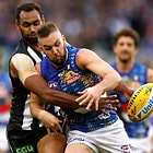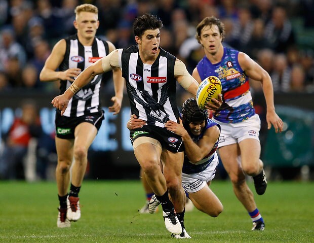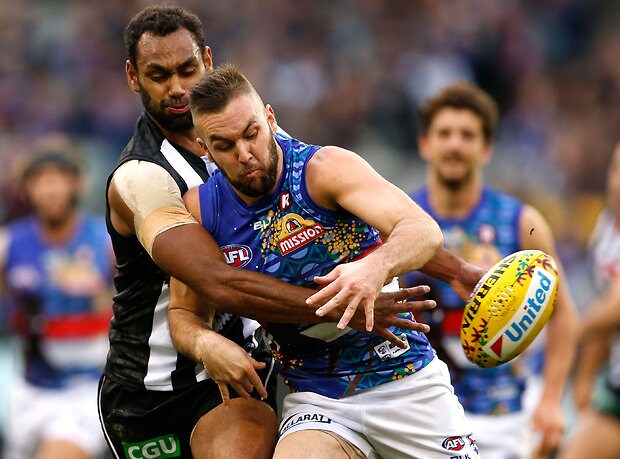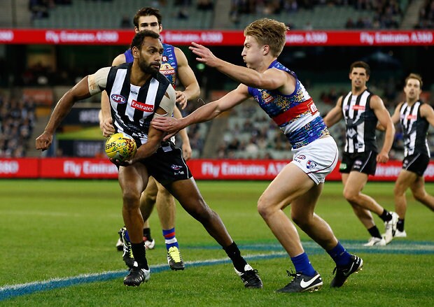 MELBOURNE, AUSTRALIA - MAY 29: Mitch Wallis of the Bulldogs is tackled by Jeremy Howe of the Magpies during the 2016 AFL Round 10 match between the Collingwood Magpies and the Western Bulldogs at the Melbourne Cricket Ground on May 29, 2016 in Melbourne, Australia. (Photo by Adam Trafford/AFL Media)