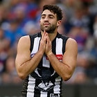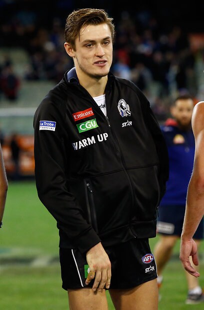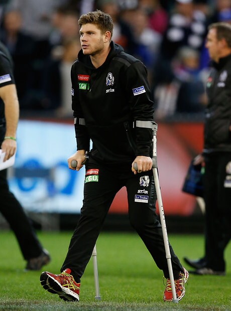 MELBOURNE, AUSTRALIA - MAY 29: An injured Darcy Moore of the Magpies looks on during the 2016 AFL Round 10 match between the Collingwood Magpies and the Western Bulldogs at the Melbourne Cricket Ground on May 29, 2016 in Melbourne, Australia. (Photo by Adam Trafford/AFL Media)