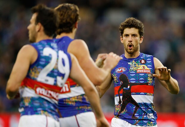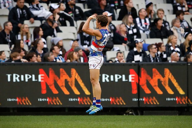 MELBOURNE, AUSTRALIA - MAY 29: Jack Redpath of the Bulldogs celebrates a goal during the 2016 AFL Round 10 match between the Collingwood Magpies and the Western Bulldogs at the Melbourne Cricket Ground on May 29, 2016 in Melbourne, Australia. (Photo by Adam Trafford/AFL Media)