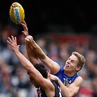 MELBOURNE, AUSTRALIA - MAY 29: Marcus Adams of the Bulldogs handpasses the ball over Jesse White of the Magpies during the 2016 AFL Round 10 match between the Collingwood Magpies and the Western Bulldogs at the Melbourne Cricket Ground on May 29, 2016 in Melbourne, Australia. (Photo by Adam Trafford/AFL Media)