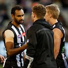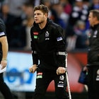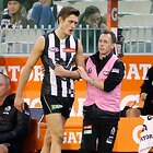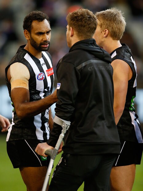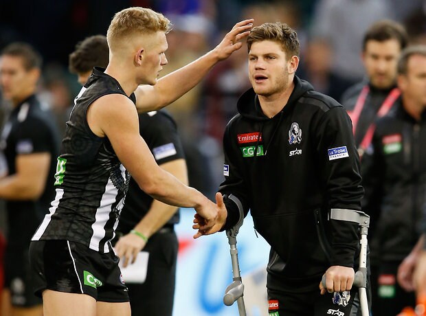 MELBOURNE, AUSTRALIA - MAY 29: Travis Varcoe of the Magpies chats to an injured Taylor Adams of the Magpies during the 2016 AFL Round 10 match between the Collingwood Magpies and the Western Bulldogs at the Melbourne Cricket Ground on May 29, 2016 in Melbourne, Australia. (Photo by Adam Trafford/AFL Media)