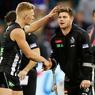 MELBOURNE, AUSTRALIA - MAY 29: Adam Treloar of the Magpies consoles Taylor Adams of the Magpies who is injured during the 2016 AFL Round 10 match between the Collingwood Magpies and the Western Bulldogs at the Melbourne Cricket Ground on May 29, 2016 in Melbourne, Australia. (Photo by Adam Trafford/AFL Media)