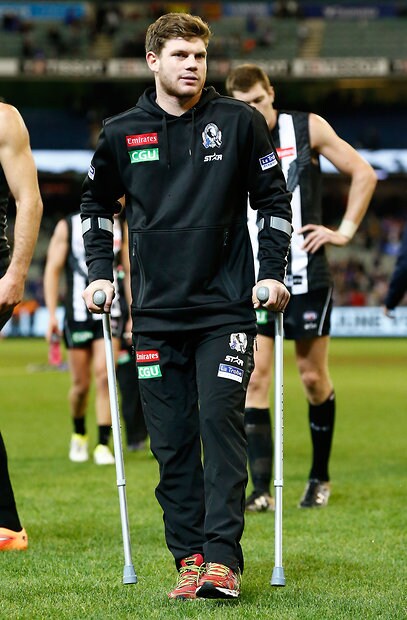 MELBOURNE, AUSTRALIA - MAY 29: An injured Taylor Adams of the Magpies looks dejected after a loss during the 2016 AFL Round 10 match between the Collingwood Magpies and the Western Bulldogs at the Melbourne Cricket Ground on May 29, 2016 in Melbourne, Australia. (Photo by Adam Trafford/AFL Media)