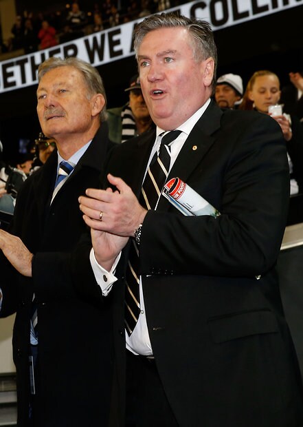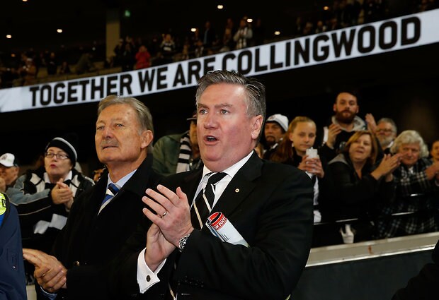 MELBOURNE, AUSTRALIA - MAY 29: Magpies President Eddie McGuire cheers the team as they come off the field during the 2016 AFL Round 10 match between the Collingwood Magpies and the Western Bulldogs at the Melbourne Cricket Ground on May 29, 2016 in Melbourne, Australia. (Photo by Adam Trafford/AFL Media)