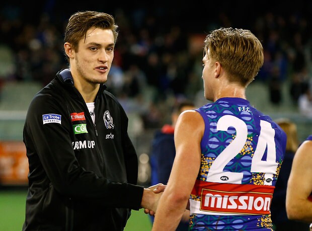 MELBOURNE, AUSTRALIA - MAY 29: An injured Darcy Moore of the Magpies shakes hands with Shane Biggs of the Bulldogs during the 2016 AFL Round 10 match between the Collingwood Magpies and the Western Bulldogs at the Melbourne Cricket Ground on May 29, 2016 in Melbourne, Australia. (Photo by Adam Trafford/AFL Media)