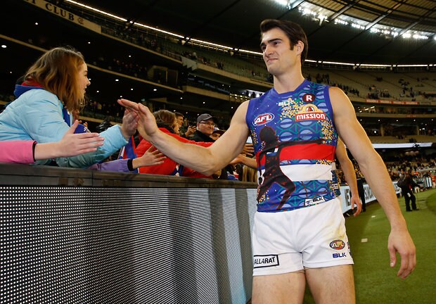 MELBOURNE, AUSTRALIA - MAY 29: Easton Wood of the Bulldogs thanks fans during the 2016 AFL Round 10 match between the Collingwood Magpies and the Western Bulldogs at the Melbourne Cricket Ground on May 29, 2016 in Melbourne, Australia. (Photo by Adam Trafford/AFL Media)