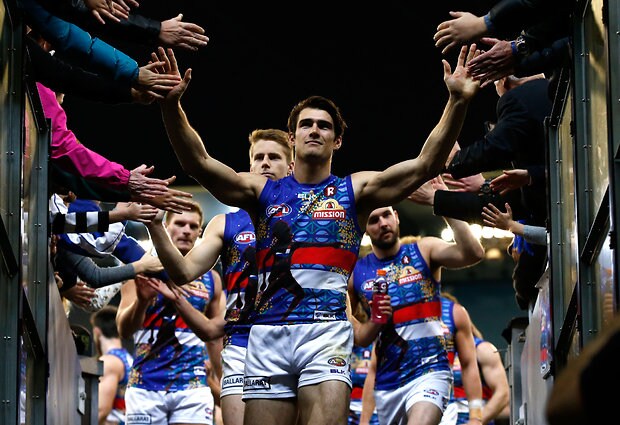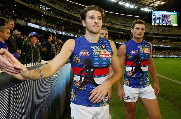 MELBOURNE, AUSTRALIA - MAY 29: Marcus Bontempelli of the Bulldogs thanks fans during the 2016 AFL Round 10 match between the Collingwood Magpies and the Western Bulldogs at the Melbourne Cricket Ground on May 29, 2016 in Melbourne, Australia. (Photo by Adam Trafford/AFL Media)