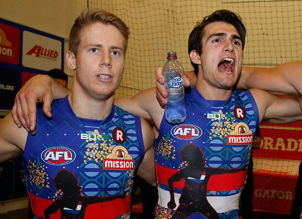 MELBOURNE, AUSTRALIA - MAY 29: (L-R) Lachie Hunter and Easton Wood of the Bulldogs sing the team song during the 2016 AFL Round 10 match between the Collingwood Magpies and the Western Bulldogs at the Melbourne Cricket Ground on May 29, 2016 in Melbourne, Australia. (Photo by Adam Trafford/AFL Media)
