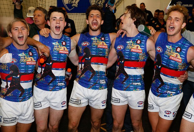 MELBOURNE, AUSTRALIA - MAY 29: Bulldogs players sing the team song during the 2016 AFL Round 10 match between the Collingwood Magpies and the Western Bulldogs at the Melbourne Cricket Ground on May 29, 2016 in Melbourne, Australia. (Photo by Adam Trafford/AFL Media)