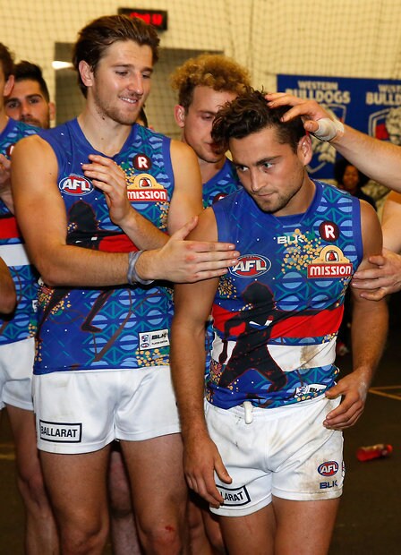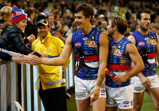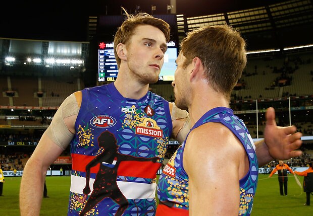 MELBOURNE, AUSTRALIA - MAY 29: Josh Dunkley and Caleb Daniel of the Bulldogs thank fans during the 2016 AFL Round 10 match between the Collingwood Magpies and the Western Bulldogs at the Melbourne Cricket Ground on May 29, 2016 in Melbourne, Australia. (Photo by Adam Trafford/AFL Media)