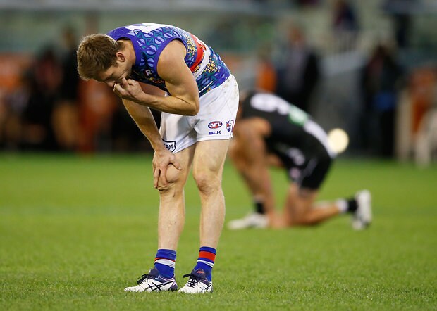 MELBOURNE, AUSTRALIA - MAY 29: Matthew Boyd of the Bulldogs catches his breath on the final siren during the 2016 AFL Round 10 match between the Collingwood Magpies and the Western Bulldogs at the Melbourne Cricket Ground on May 29, 2016 in Melbourne, Australia. (Photo by Adam Trafford/AFL Media)