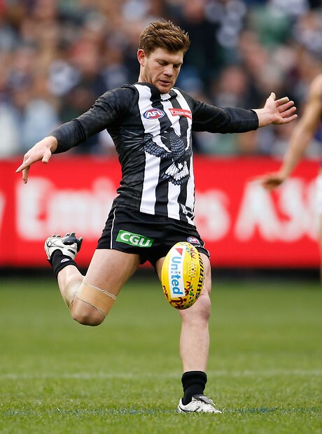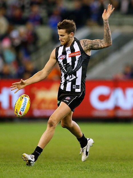 MELBOURNE, AUSTRALIA - MAY 29: Jeremy Howe of the Magpies kicks the ball during the 2016 AFL Round 10 match between the Collingwood Magpies and the Western Bulldogs at the Melbourne Cricket Ground on May 29, 2016 in Melbourne, Australia. (Photo by Adam Trafford/AFL Media)