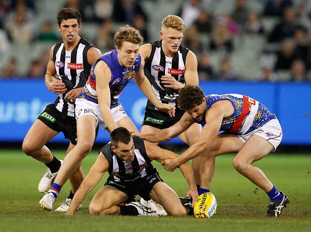 MELBOURNE, AUSTRALIA - MAY 29: Levi Greenwood of the Magpies and Tom Liberatore of the Bulldogs compete for the ball ahead of Scott Pendlebury of the Magpies, Jack Macrae of the Bulldogs and Adam Treloar of the Magpies during the 2016 AFL Round 10 match between the Collingwood Magpies and the Western Bulldogs at the Melbourne Cricket Ground on May 29, 2016 in Melbourne, Australia. (Photo by Adam Trafford/AFL Media)