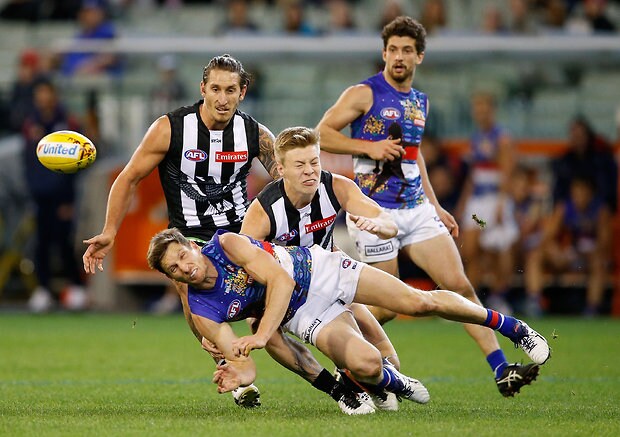 MELBOURNE, AUSTRALIA - MAY 29: Matthew Boyd of the Bulldogs handpasses the ball ahead of Jordan De Goey and Jesse White of the Magpies during the 2016 AFL Round 10 match between the Collingwood Magpies and the Western Bulldogs at the Melbourne Cricket Ground on May 29, 2016 in Melbourne, Australia. (Photo by Adam Trafford/AFL Media)